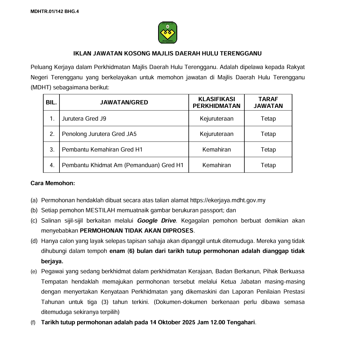 - Tarikh Tutup Permohonan : 14 OKTOBER 2025 JAM 12.00 TENGAHARI